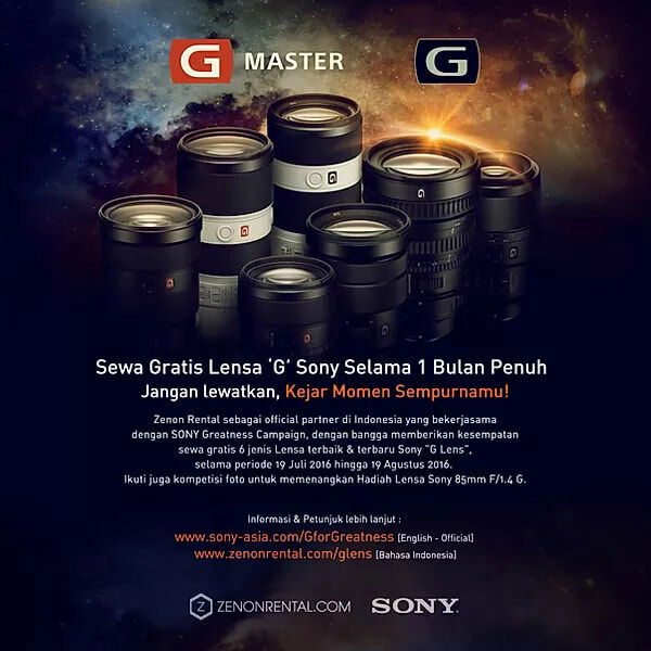 Kami merupakan satu-satunya rental house yang mewakili Indonesia yang ditunjuk oleh Sony Asia melalui Orbital Group Singapore untuk menyelenggarakan program kampanye "G Lens" secara serentak di negara-negara Asia Pasifik. Acara ini merupakan penyewaan gratis berbagai varian lensa G selama sebulan penuh dari tanggal 19 Juli - 19 Agustus 2016