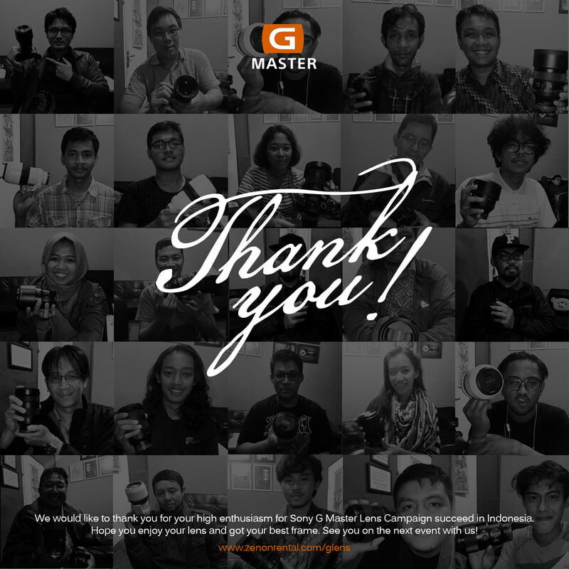 Terima kasih atas kepercayaan Sony Asia kepada kami dengan terselenggaranya Sony G Lens Campaign selama periode 19 Juli hingga 19 Agustus 2016. Terima kasih juga untuk antusiasme yang sangat tinggi dari para fotografer dan videografer dalam menyukseskan acara ini di Indonesia.