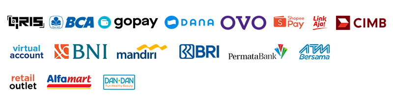 - QRIS : BCA, Gopay, Dana, Ovo, Shopee Pay, Link Aja, CIMB, Astra Pay, dll.