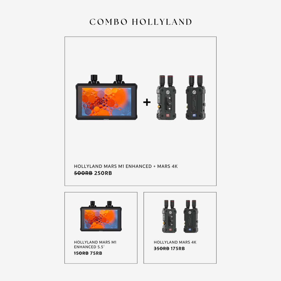 Hollyland Mars M1 Enhanced 5.5" dari harga sewa Rp 150.000 menjadi Rp 75.000, Hollyland Mars 4K Wireless Video Transmission System dari harga sewa Rp 350.000 menjadi Rp 175.000. atau jika mau kedua produk tersebut Hollyland Mars M1 Enhanced 5.5" + Hollyland Mars 4K Wireless Video Transmission System dari harga sewa digabungkan Rp 500.000 menjadi Rp 250.000.
