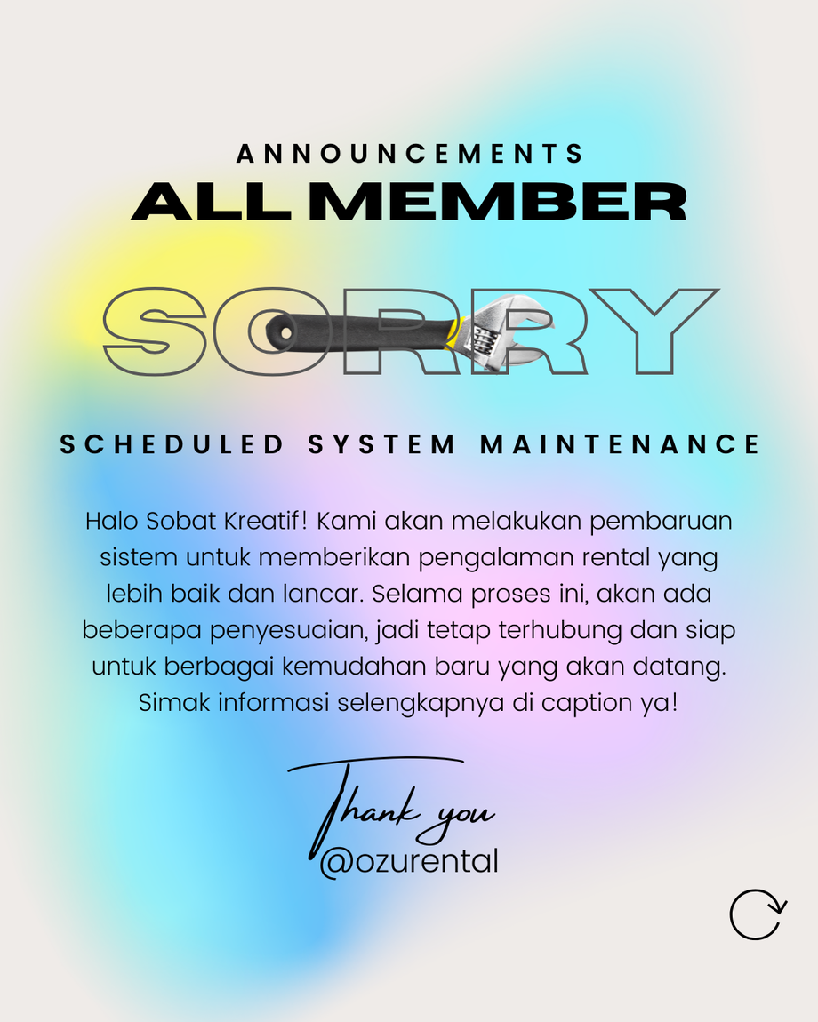 Kami ingin menginformasikan bahwa OZU Rental akan melakukan pembaruan sistem demi meningkatkan kualitas pelayanan. Proses ini akan memberikan pengalaman rental yang lebih nyaman dengan hadirnya fitur-fitur baru! 💻✨